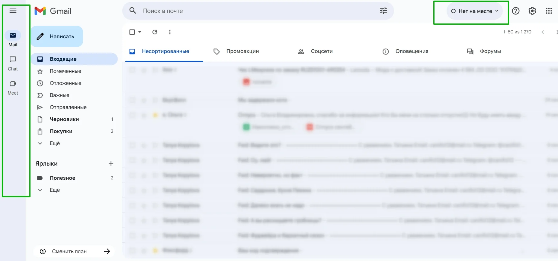Если вдруг с левой стороны почтового клиента появилась дополнительная панель, но вы ею никогда не пользуетесь, ее можно убрать. Это сервисы Google Chat и Google Meet, которые на самом деле мало кому нужны прямо внутри почты и только занимают лишнее место.