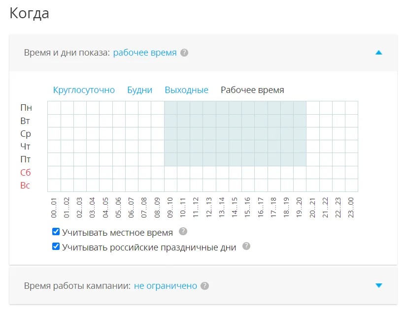 Ещё одна полезная функция — «Учитывать российские праздничные дни». Так вы будете показывать рекламу только в рабочие дни.
