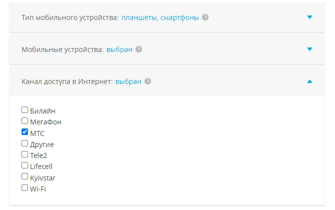 MyTarget позволяет выбрать тип мобильного устройства: планшет или телефон. А также марку устройства, например, Apple, Samsung, Huawei и т.д. Кроме того, система умеет учитывать канал доступа в интернет: Билайн, МегаФон, МТС, Tele2, Lifecell, Kyivstar, Wi-Fi и другие.