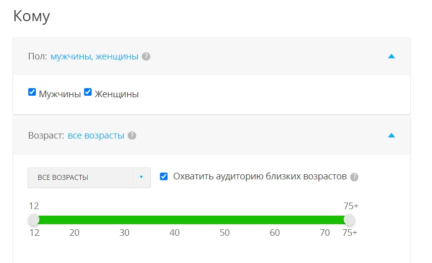 Пол. Можно таргетироваться отдельно на женщин или на мужчин. Если не знаете пол аудитории, выбирайте оба варианта.