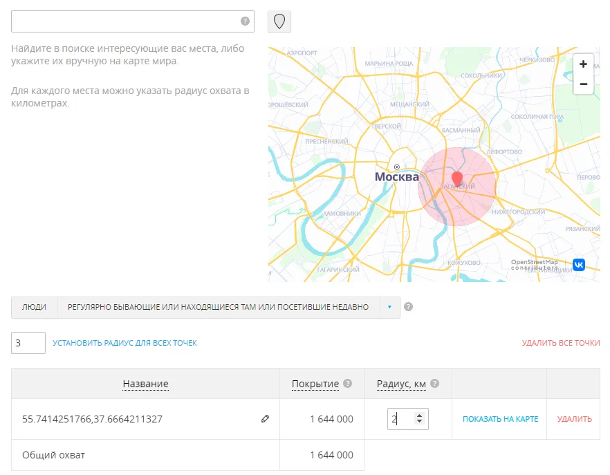 Для настройки поставьте метку на карте. После этого система покажет, какой вероятный охват вы получите. Он вычисляется на основе того, сколько людей из целевой аудитории находились в радиусе метки в течение 7 последних дней.