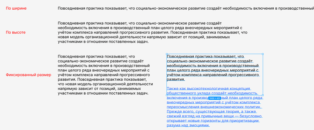 Фиксированный размер. Ширина и высота контейнера не меняется при уменьшении/увеличении объема текста.
