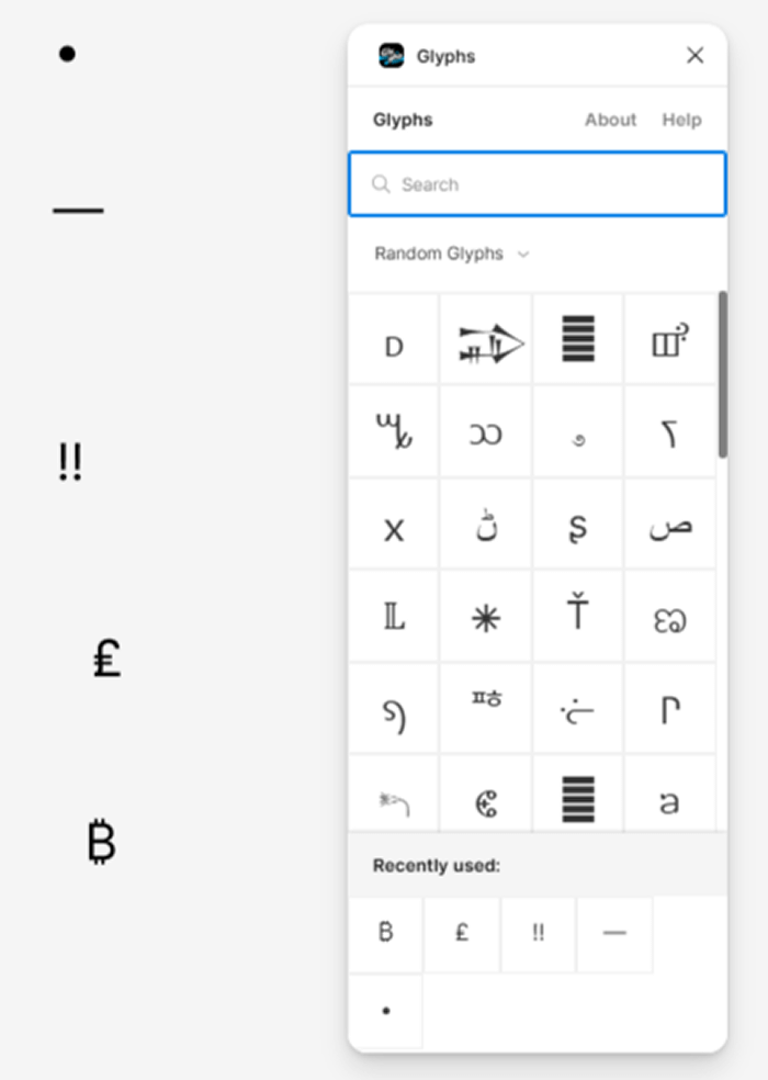 Особенности: библиотека с глифами — графическими изображениями символов. Есть знаки пунктуации, стрелки, знаки валют и другое.