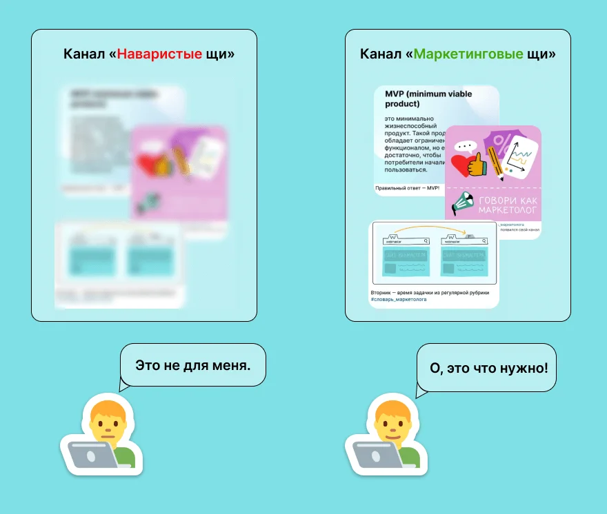 Лучше учесть интересы аудитории в названии, тогда суть контента будет считываться быстро и канал будет набирать целевых подписчиков. Условно, если бы канал о маркетинге назывался не «Маркетинговые щи», а «Наваристые щи», вряд ли бы целевая аудитория решила, что на канале публикуют полезный контент для маркетологов и диджитал-специалистов, а не рецепты. Только если бы мы рассказали об этом и подписчики прочитали описание.