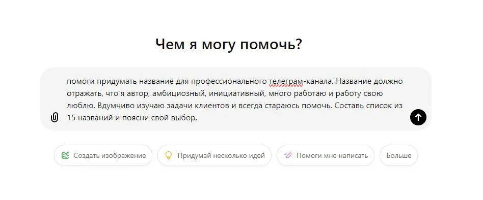 Возьмем вымышленного коммерческого автора и попросим нейросеть придумать ему название канала по инструкции. Инструкции нейросетям лучше давать подробные: объяснять как будто глуповатому, но усердному исполнителю. Поэтому чем конкретнее запрос, тем лучше справится нейросеть.