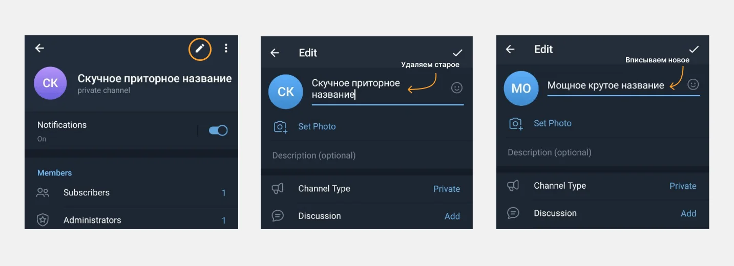 Юзернейм — это название, которое будет отображаться в ссылке на канал. Например, у канала «Бизнес-секреты» юзернейм — bs_business. Когда люди будут делиться ссылкой на канал, в ней будет отображаться юзернейм вместо набора букв по умолчанию. Также через @ можно перейти на канал. Например, ввести @bs_business в строке поиска или написать в сообщении и без ссылки попасть на канал.