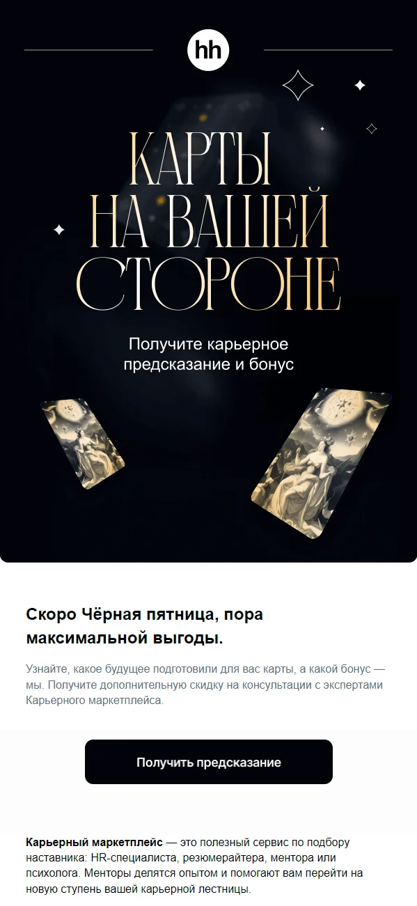 Почему работает. Немного волшебства, когда речь идёт о серьёзной теме (например, карьере), — это всегда привлекает внимание. Особенно, если магические предсказания дополняются действительно полезными предложениями. В случае с HH.ru — скидкой на консульцию в Карьерном маркетплейсе.