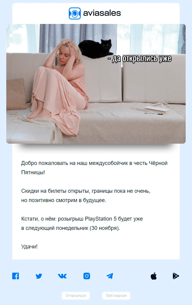 Почему работает. В разгар пандемии и закрытых границ Aviasales позвали всех на распродажу билетов. И хотя направлений было мало, кому очень хотелось куда-то улететь — смогли бы воспользоваться предложением. А для остальных компания напомнила: есть жизнь и в пандемию, и после Чёрной пятницы — и анонсировала розыгрыш ценного приза в конце ноября.