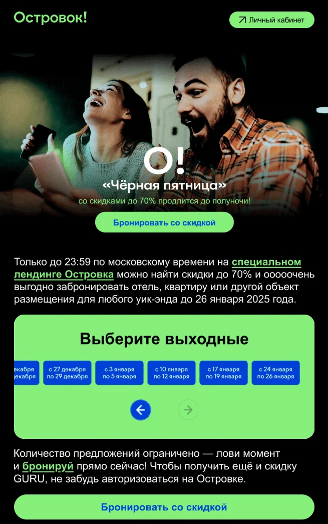 Почему работает. Отличная скидка, ограниченное предложение (только до полуночи) _ высокий сезон: платформа предлагает забронировать жильё в период до 26 января следующего года. А новогодние праздники — традиционно горячий сезон в туризме, когда цены на гостиницы и апартаменты просто взлетают.