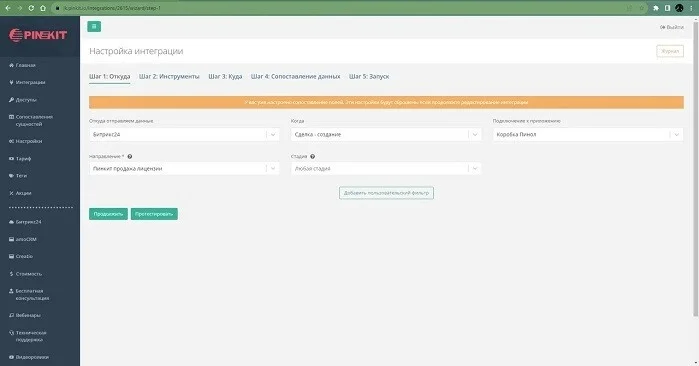 Дальше, если кратко, звонки из нашей CRM-системы нейронка переведет в текст, обработает и выгрузит список подходящих компаний в новую воронку «Потенциальные клиенты». Для этого с помощью Пинкит настраиваем автоматическое создание сделок по заданным критериям: