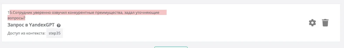 Кроме оборота компании, суммы оплаченных счетов и купленных позиций, можно указать дополнительные параметры, которые помогут более предметно взаимодействовать с клиентом. К примеру, сделать запрос Yandex GPT, есть ли в звонке упоминание интеграций CRM с внешними сервисами, слова-маркеры удовлетворенности или «сложности» клиента: мне нравится/я не доволен/есть вопросы и другие. А также то, что касается качества работы менеджера: