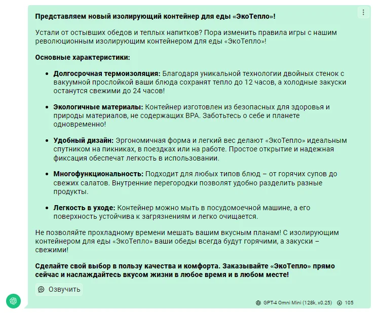 Например, можно попросить нейросеть написать рекламный текст для термоконтейнера. Она здорово опишет его характеристики, но не учтет целевую аудиторию — занятых людей на правильном питании. Поэтому их сгенерированный текст просто не зацепит.