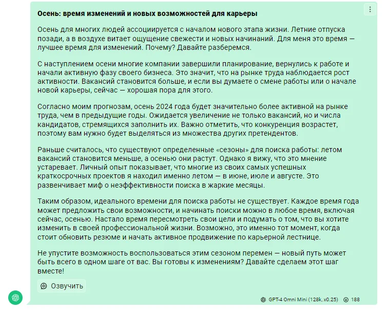 Нейросети просто компилируют уже существующую информацию. Если писать экспертную статью с ChatGPT, ничего нового в ней не будет. А живой автор сможет взять комментарий у специалиста, рассказать о трендах или новых инструментах. Так что в этом плане нейросеть всегда отстает от современной реальности.