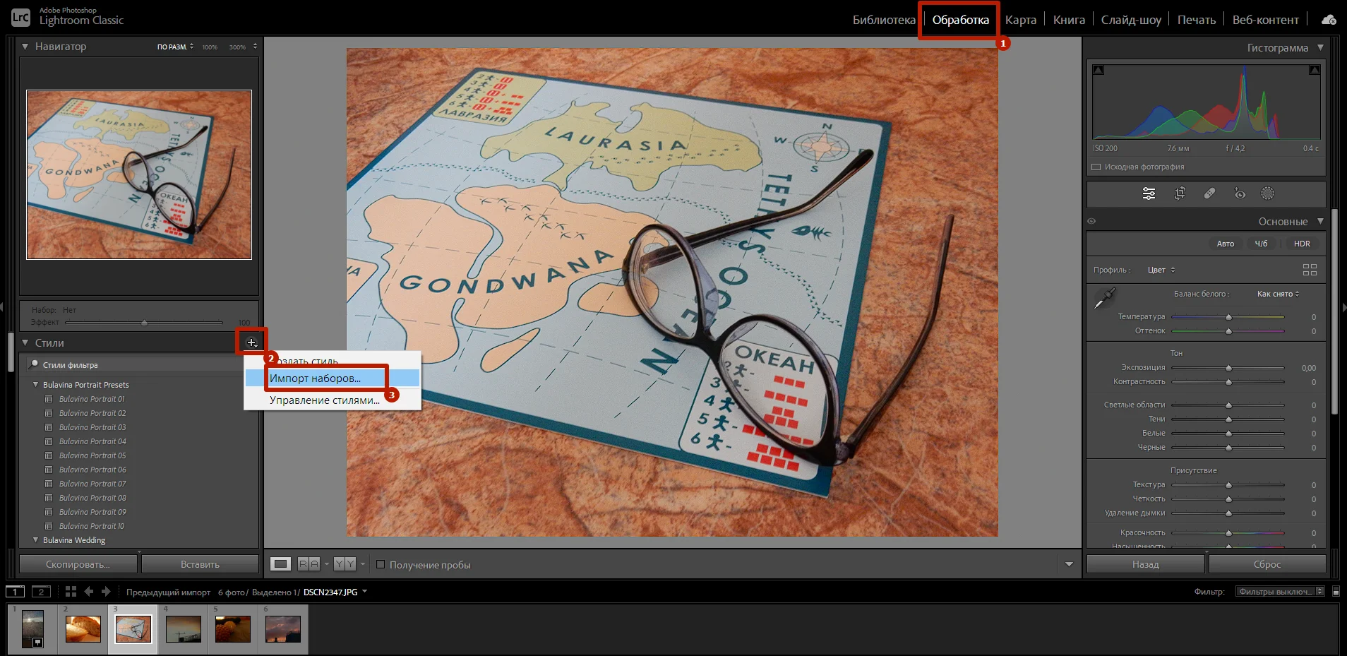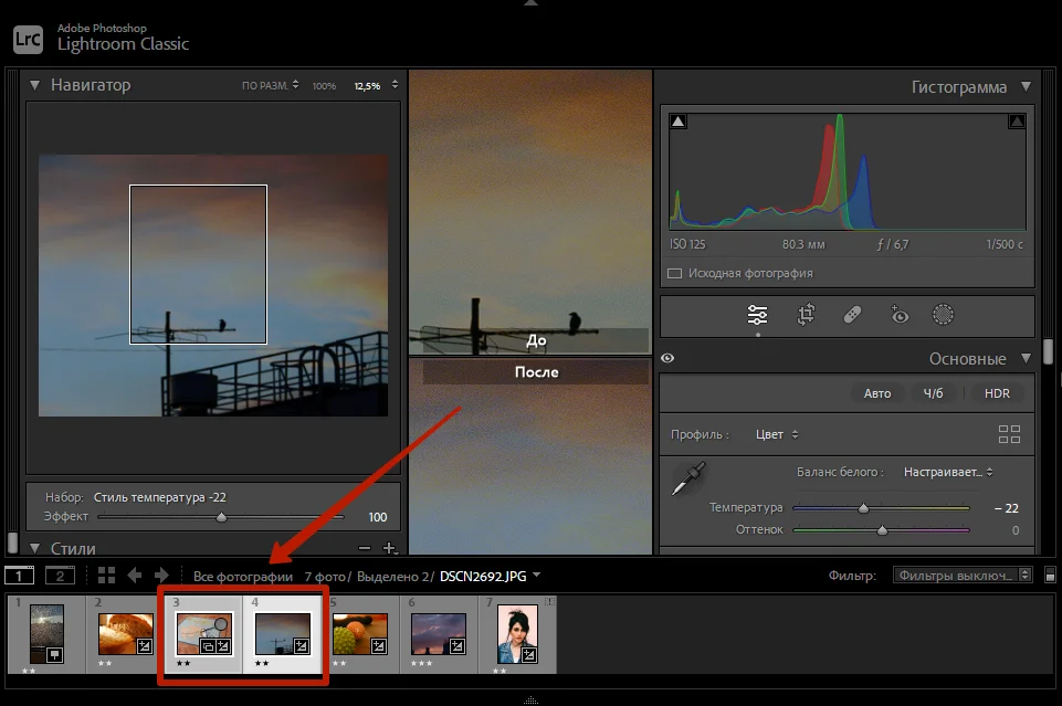 Сначала нужно обработать один из кадров с помощью стиля или пресета. Затем выделить все фото — навести курсор мыши на нижнюю часть экрана и выбрать снимки, зажав клавишу Shift или Ctrl.