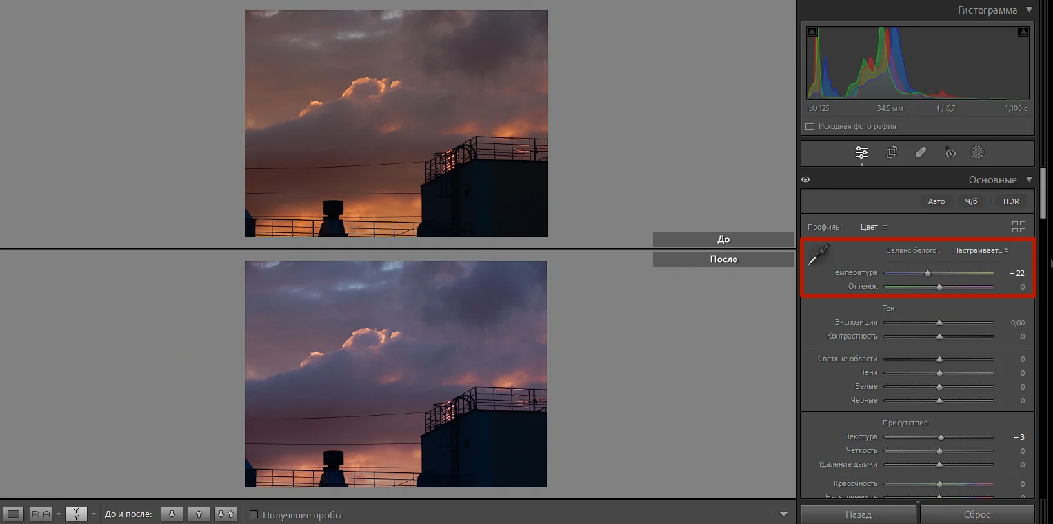 Самый простой способ обработки — использовать базовые функции программы. Под гистограммой находятся два варианта цветокоррекции: