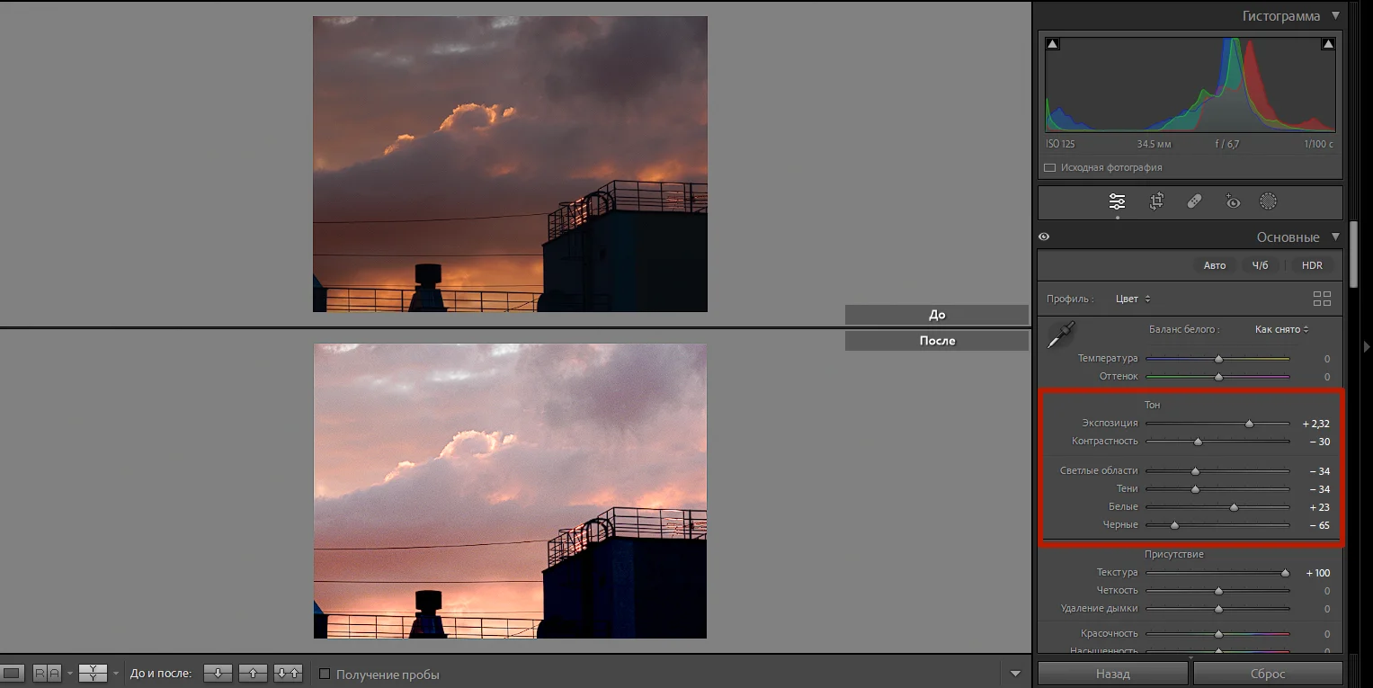 Тон (Tone). В настройках можно изменить общую экспозицию и контрастность — насколько фото будет светлым или темным, а также насколько четкими будут детали. С помощью детальных настроек можно работать отдельно со светлыми и темными областями.