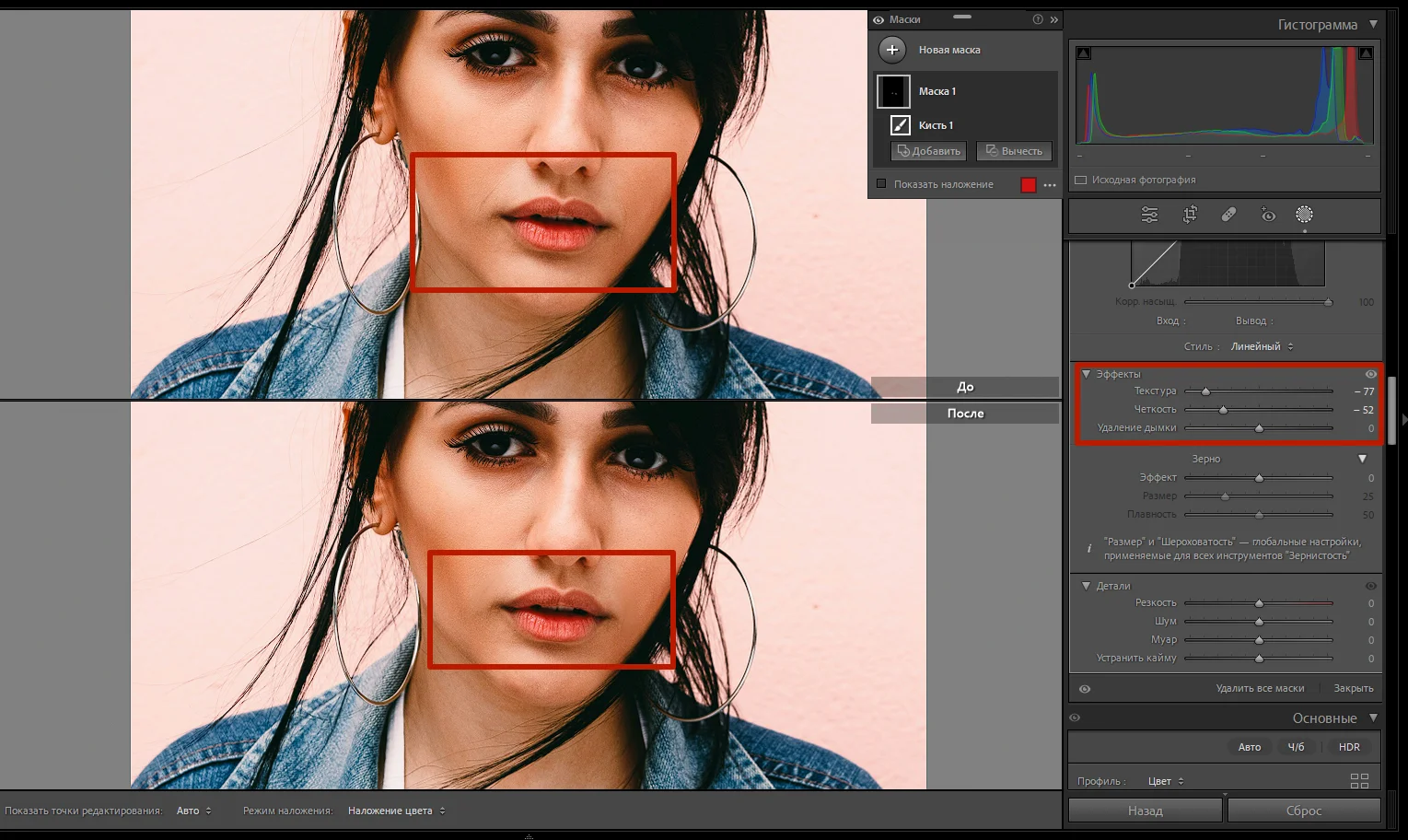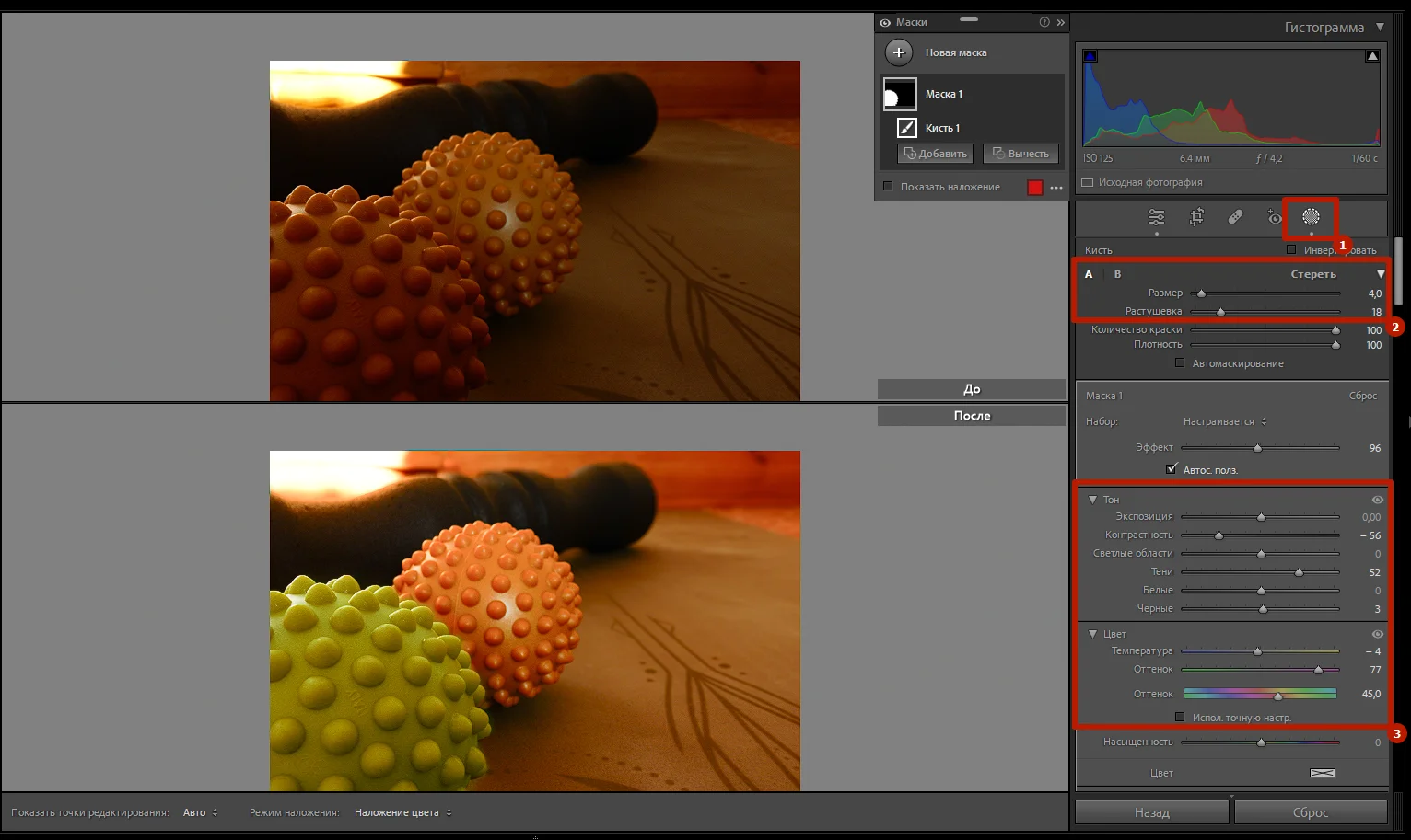 В «Лайтруме» можно работать с отдельными областями фото. Например, изменять их цвет, яркость и контраст. Для этого нужно выбрать инструмент «Маска» под гистограммой и выделить конкретную область. А затем применить к ней настройки для «Маски 1» в правой части экрана. Рисовать маски нужно вручную инструментом «Кисть», его диаметр легко изменять с помощью колесика мышки.