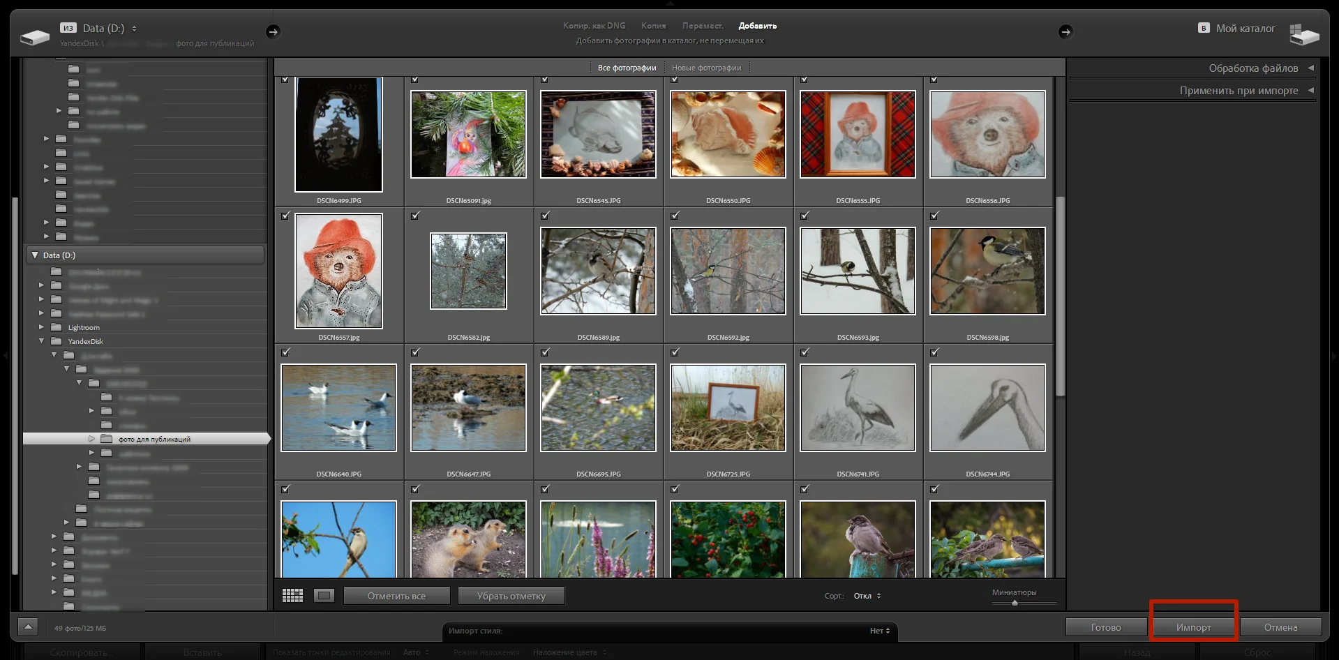 В источниках слева видны все папки на устройстве, а в области выбора — превью кадров. Чтобы завершить процесс, нужно еще раз нажать «Импорт» — уже в правом нижнем углу.
