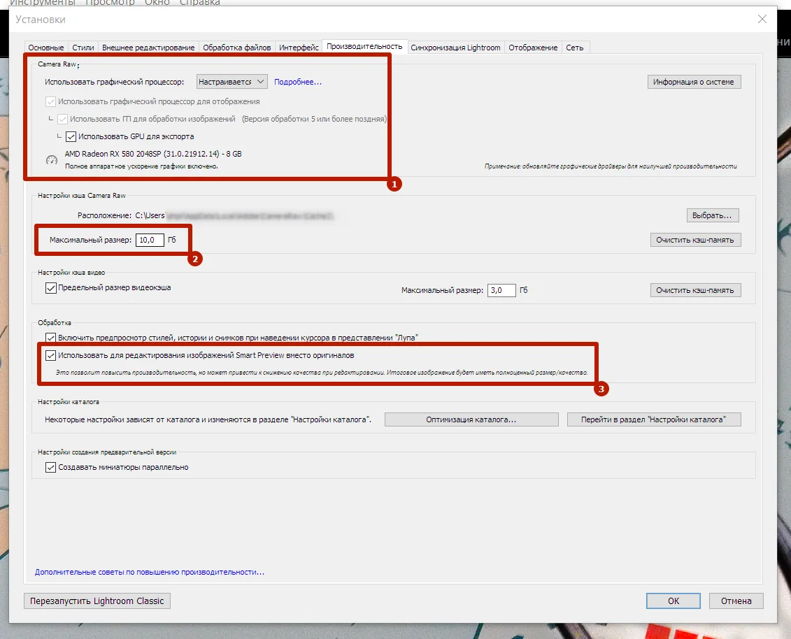 Lightroom — довольно тяжелая программа, которая занимает много оперативной памяти ПК. Чтобы уменьшить нагрузку на систему и улучшить скорость работы, лучше переместить процессы в память видеокарты.