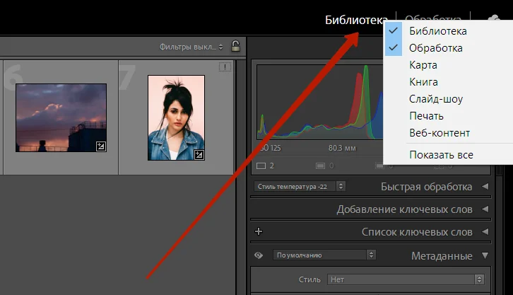 Кроме того, можно отключить лишние модули, которые мы не будем использовать при обработке фото — «Карта», «Книга», «Слайд-шоу», «Печать», «Веб-контент». Это можно сделать, нажав правой кнопкой мыши возле названия одного из модулей.