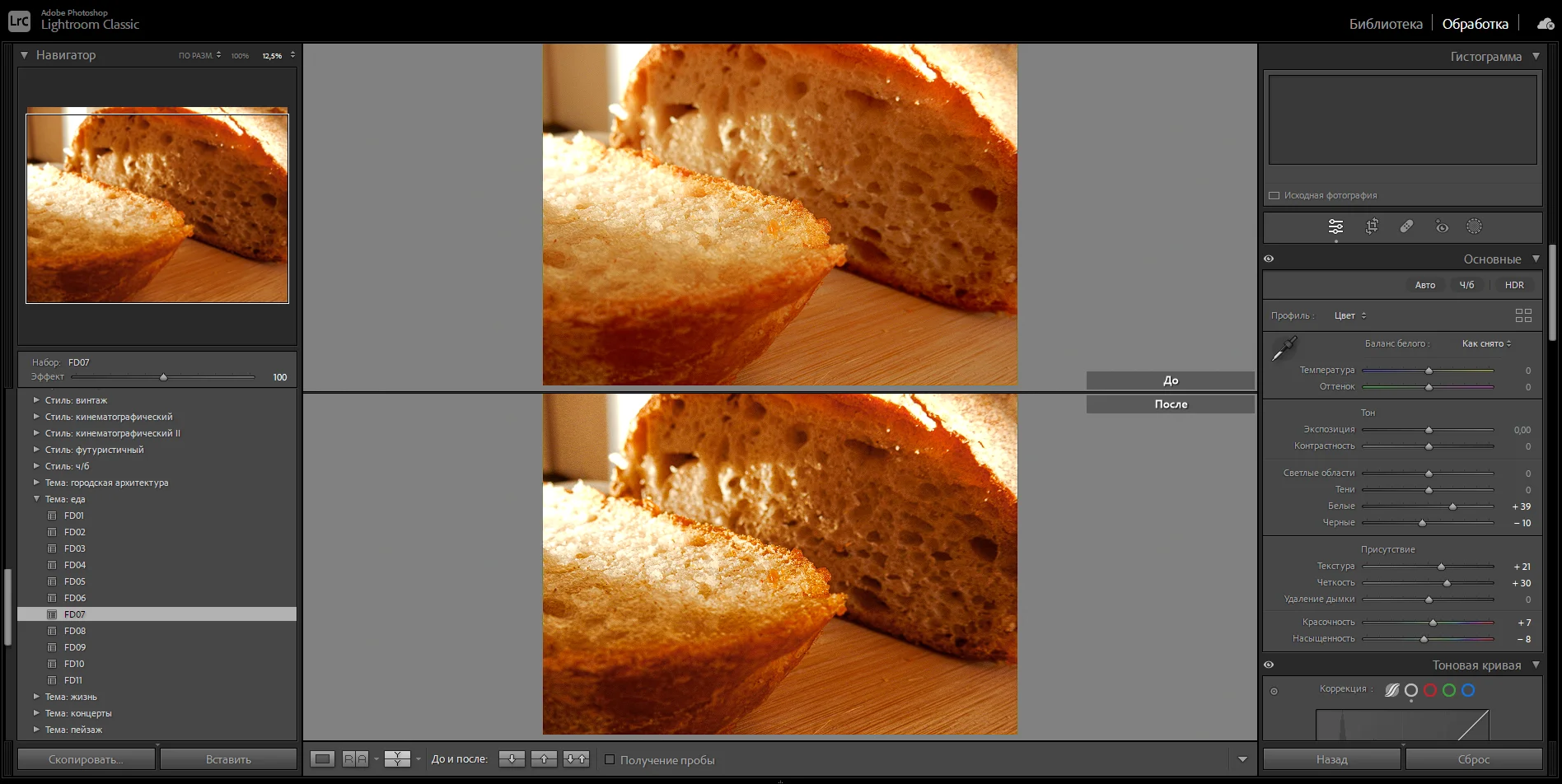 Характер обработки зависит от жанра фотографии. Например, свадебная съемка может проходить в помещении и на улице, в любую погоду. В наборе пресетов будут настройки для высветления снимка, корректировки освещения. А во время фуд-съемки важно передать детали — сочность дольки апельсина, хруст корочки хлеба. Пресет будет выкручивать контрастность и работать с текстурой, чтобы получились красивые фото.