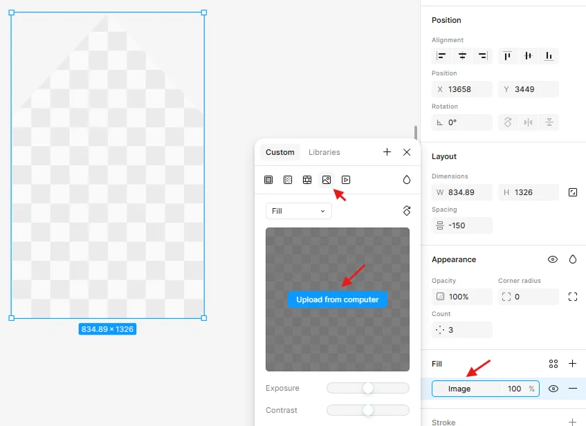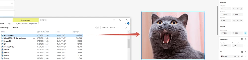 Для начала добавляем картинку: находим нужный файл на ПК и перетаскиваем его в рабочее пространство Figma.
