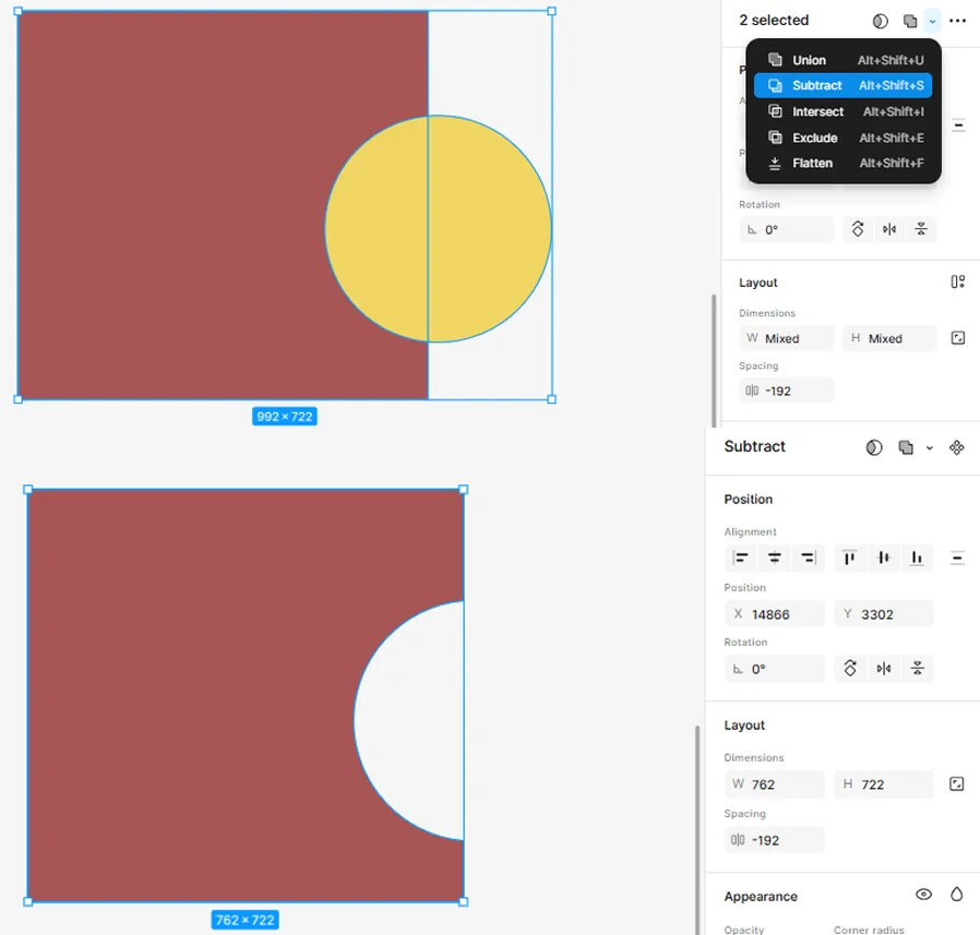 Subtract — вычитание верхней фигуры. Можно «откусить» часть нижнего элемента.