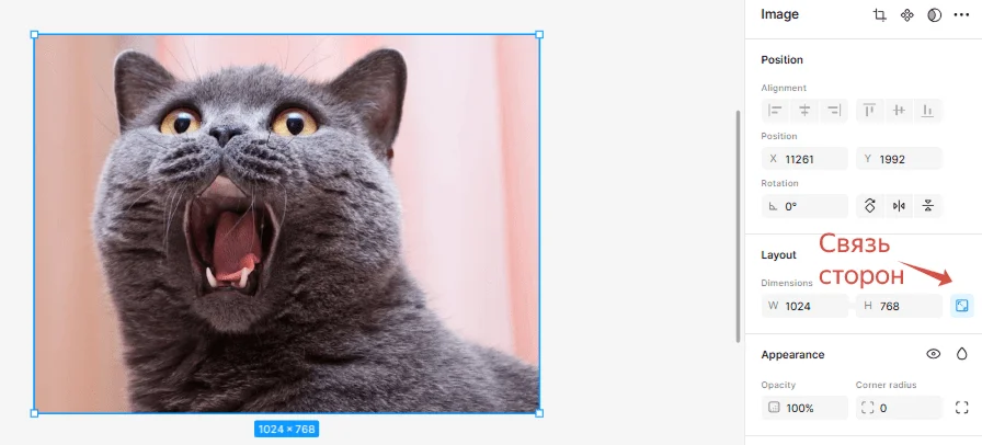 Размеры. В разделе Layout настраиваем высоту и ширину изображения. Квадратный значок справа означает связь сторон: т.е. при изменении одного параметра автоматически меняется и другой. Это помогает сохранять пропорции.
