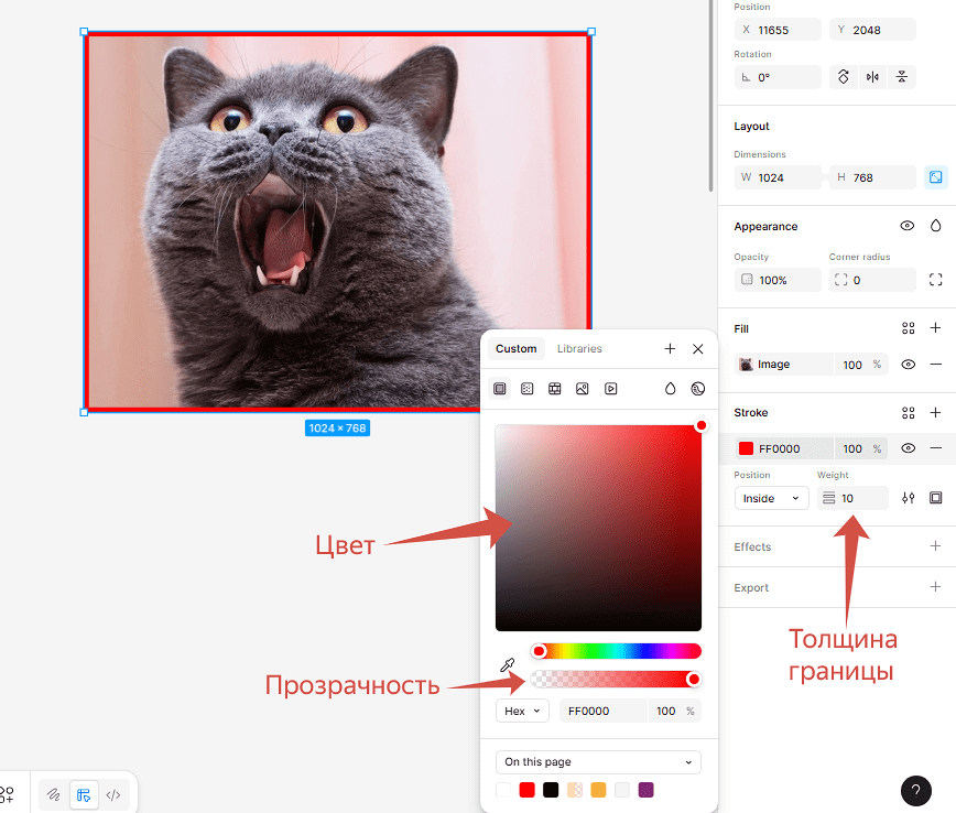 Границы. Stroke — это границы, или рамка вокруг изображения. Можно задавать цвет, прозрачность, толщину.