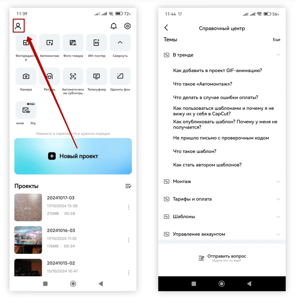 Чтобы начать работу, достаточно просто установить софт на устройство. Регистрация в CapCut дает бонус — доступ к справочному центру. Внутри база знаний по трендовым эффектам, монтажу, шаблонам и управлением аккаунтом. Пройти авторизацию можно через разные соцсети, а также по почте.