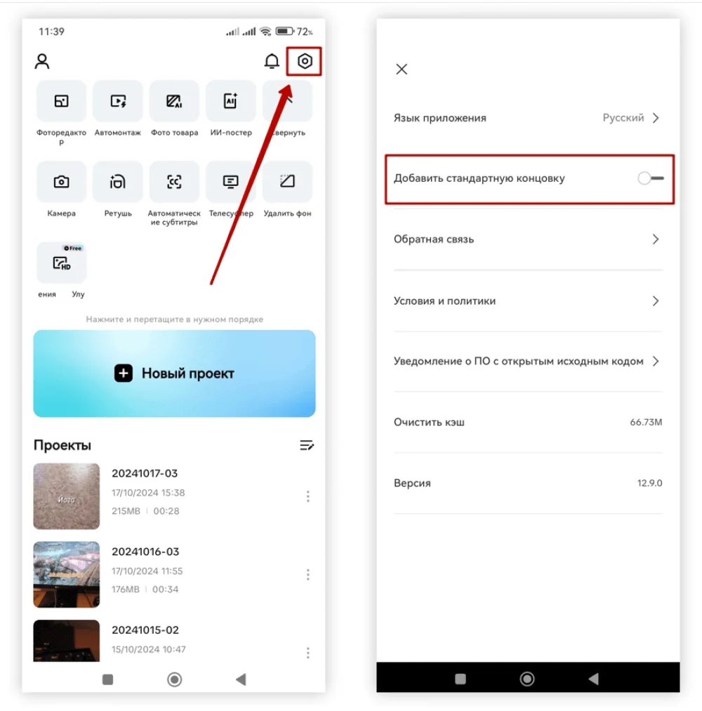 В конце ролика добавляется водяной знак с логотипом компании. Чтобы его убрать, нужно нажать на иконку шестеренки в правом верхнем углу главного меню, перейти в настройки и выключить опцию «Добавить стандартную концовку».