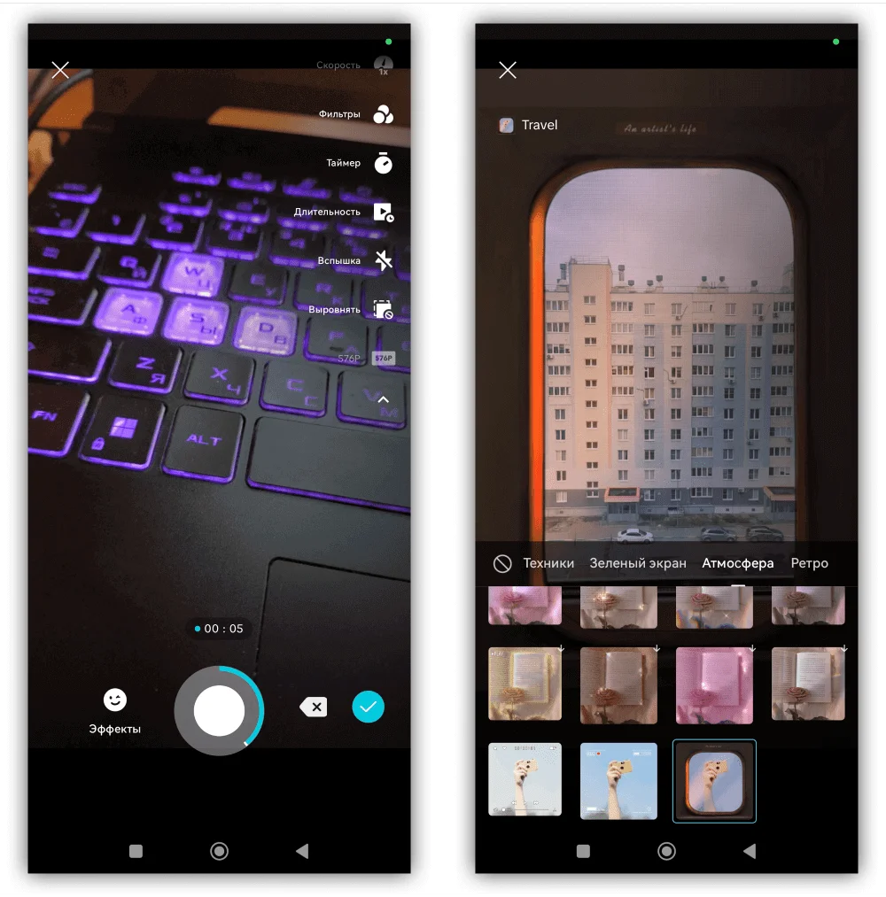 Эффекты. Можно выбрать готовый вариант изменения цвета, света и дополнительных деталей в кадре. С помощью эффектов можно создать атмосферу. Например, снять видео днем и наложить закат солнца поверх. Или же сначала размыть кадр, а затем сделать его четким и оставить акцент на происходящем.