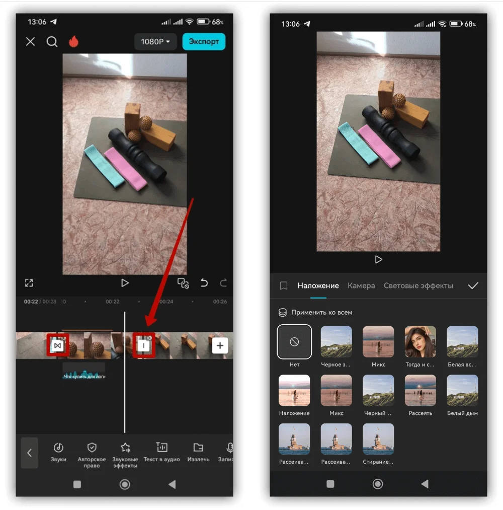 Чтобы переходы между разными видео внутри ролика выглядели плавно, добавим склейки. Нажимаем на белый квадрат на таймлинии и выбираем один из вариантов. После этого полоска заменяется на значок.