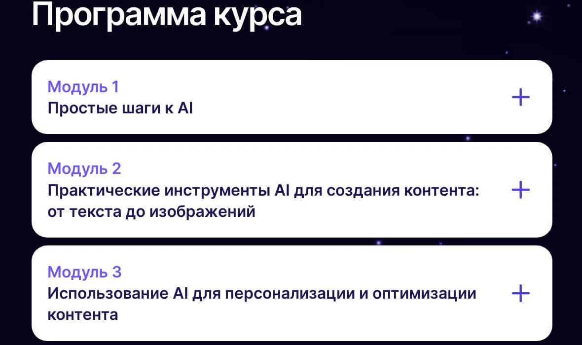 Чему научитесь. Курс разделен на пять модулей, по несколько уроков в каждом. Авторы пошагово объясняют, как зарегистрироваться в ChatGPT и Claude, как составлять в них запрос и как использовать ИИ-инструменты в контент-маркетинге.