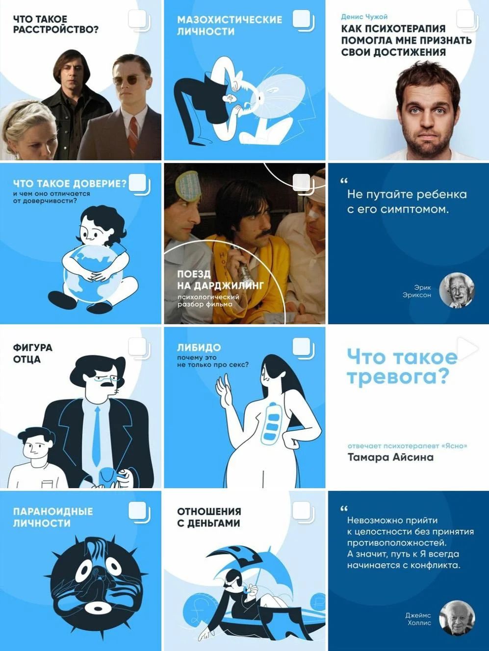 Актуальные дизайн-приёмы. Строгий шахматный порядок и «мозаику» из фото сейчас почти не используют — эти приёмы трансформировались и стали более неформальными. Например, фотоконтент часто сочетают с однотонными цветными квадратами — на них могут быть надписи или цифры.