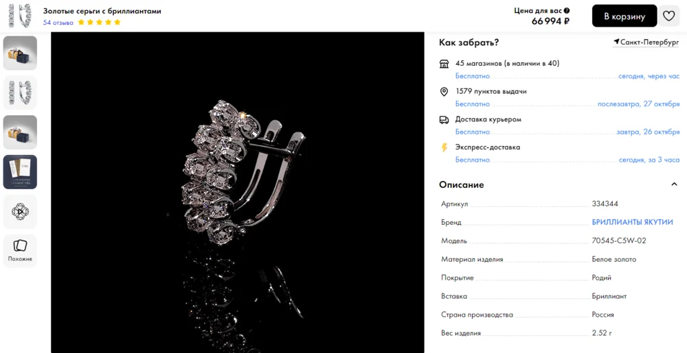 Если выбрать какой-то из пунктов в фильтрах, товары появляются. На скрине — карточки изделий из белого золота.