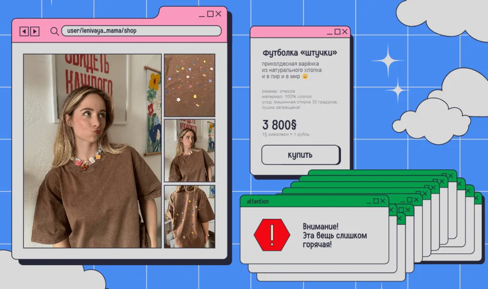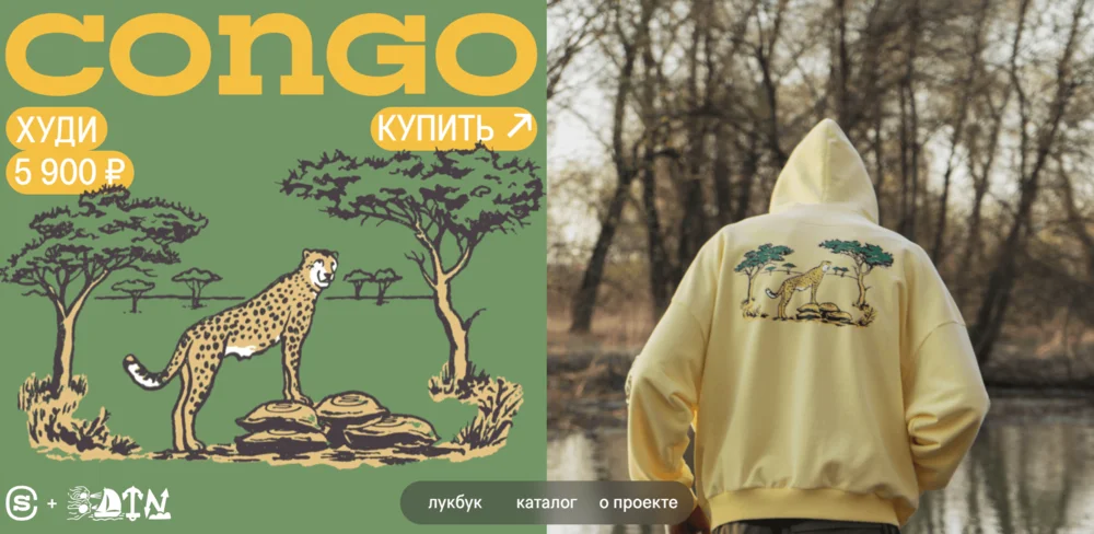 В магазине Coffantasy от кофейни Skuratov Coffee представлен лукбук, разделяющий экран на две части. Слева — принт с одежды крупным планом, справа — модель, демонстрирующая этот предмет одежды.