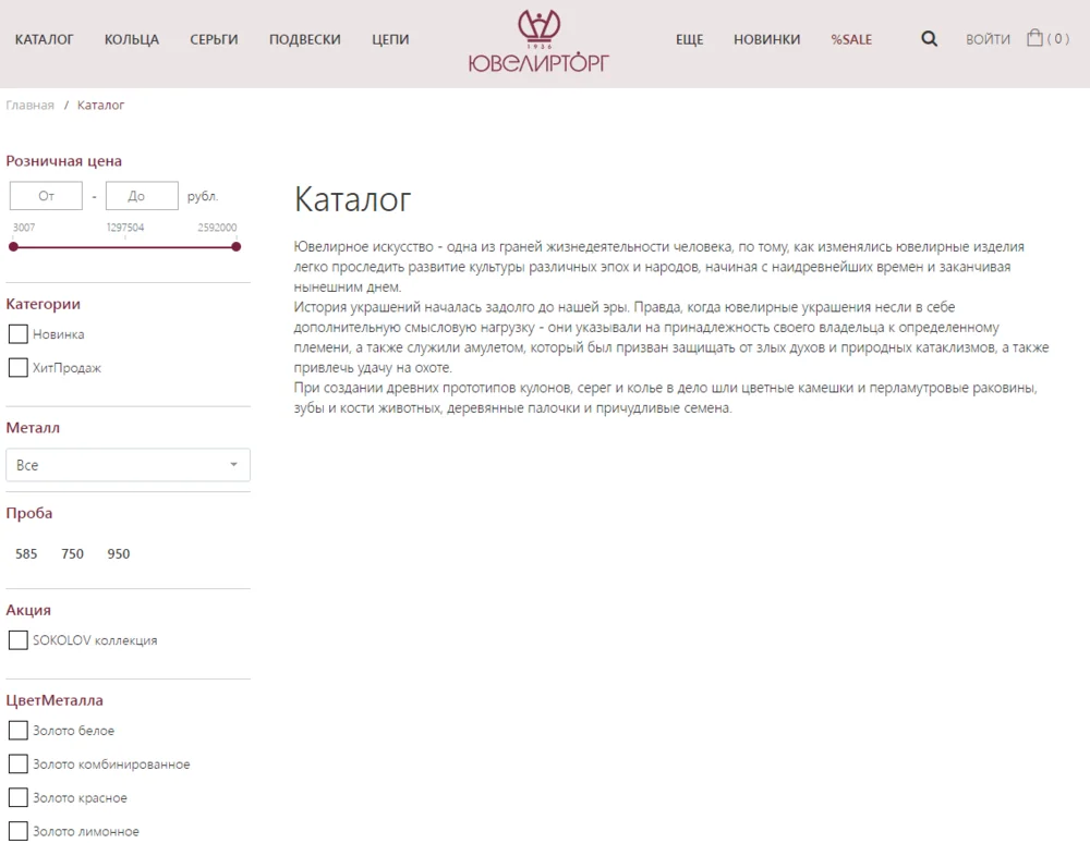 Когда каталогах нет внутренней логики, они запутывают посетителей. На сайте «Ювелирторга» разделы «Каталог», «Кольца», «Подвески», «Цепи» вынесены в меню. То есть категории, которые должны быть в каталоге, почему-то стоят отдельно. При переходе в сам каталог открывается страница, где нет карточек товаров, но есть фильтры.