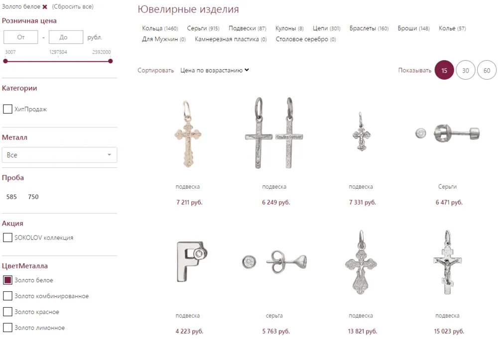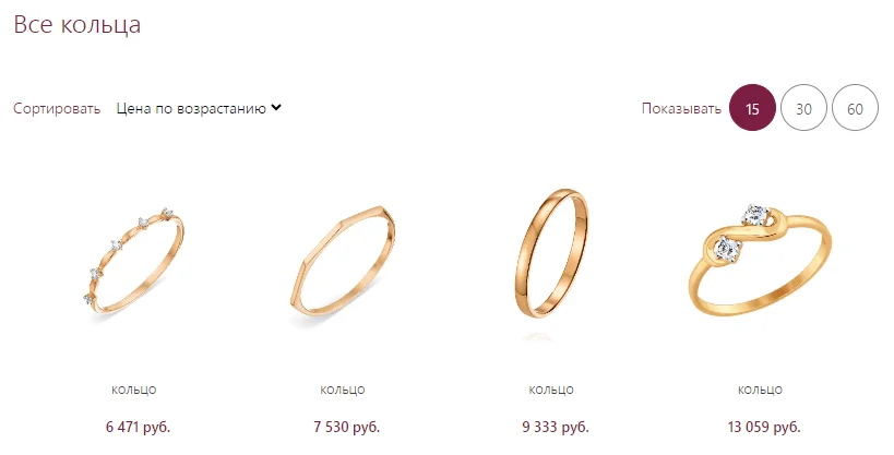 Количество товаров на странице настраивается далеко не везде, но это может быть удобной фишкой: одним пользователям удобнее скроллить, а другим переходить по страницам. «Ювелиторг» предлагает показывать по 15, 30 или 60 изделий.