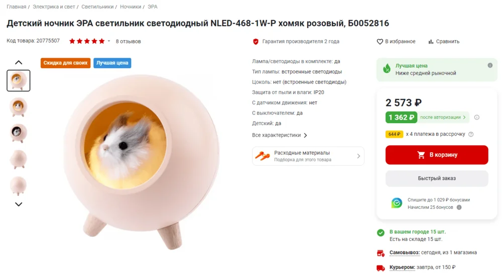 Пример маршрута для карточки на «ВсеИнструменты»: «Главная» — «Электрика и свет» — «Светильники» — «Ночники» — «ЭРА» — «Детский ночник ЭРА NLED-468-1W-P».