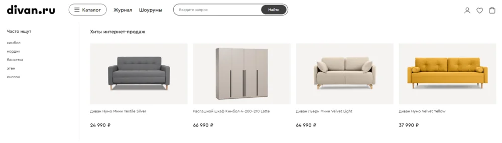 У divan.ru в разделе поиска можно увидеть частые запросы и хиты продаж.