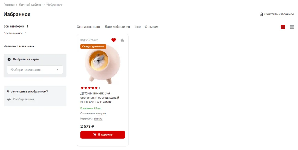 В карточке товара обычно есть кнопки для добавления товара в «Избранное» и в «Корзину».