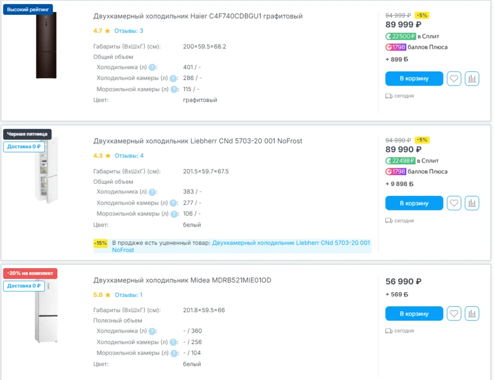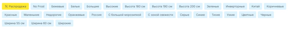 Ниже — скрин сайта Holodilnik.ru. При поиске холодильника покупатели могут ориентироваться на цвет, высоту, необходимость разморозки, и в тегах это учли.