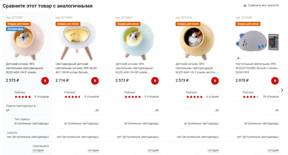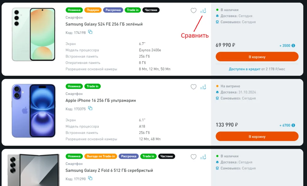В карточках рядом есть значок «Сравнить», который добавляет товары в список сравнения.