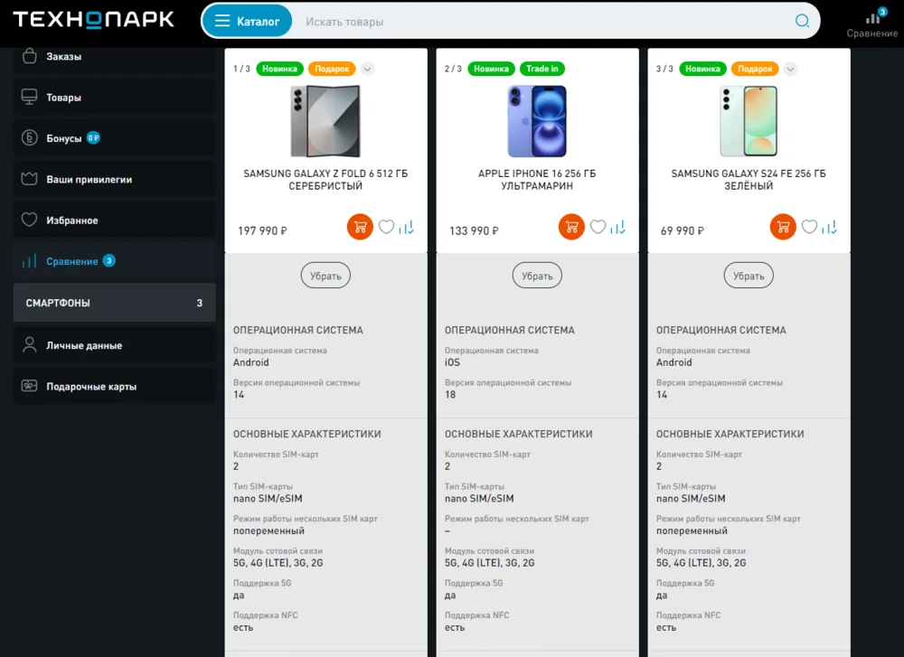 Покупатель может собрать товары в табличку и сравнить характеристики. Показываем на примере «Технопарка».