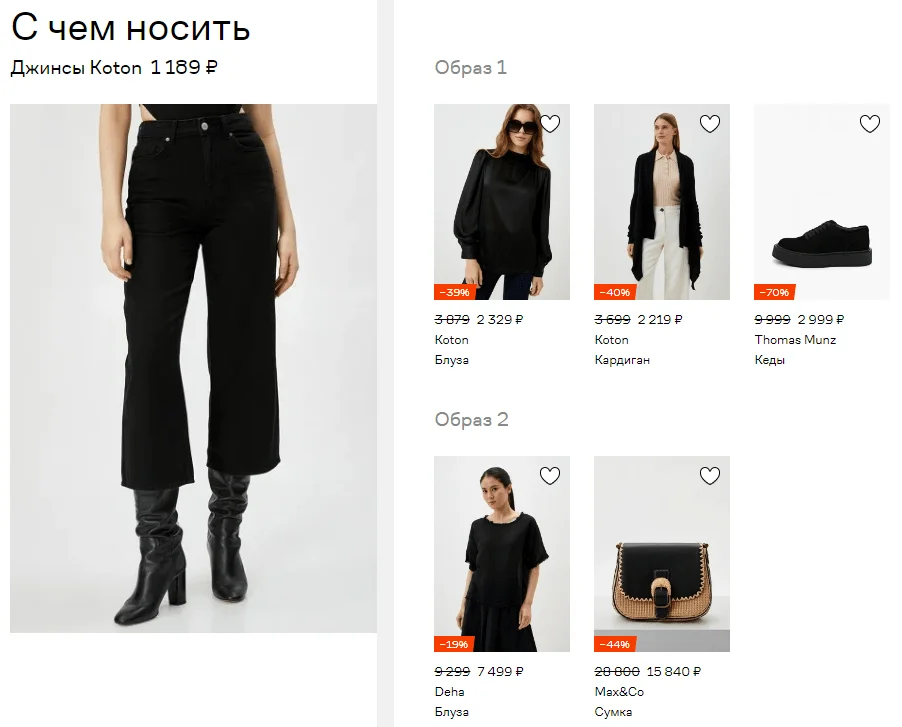 Подобное решение актуально не только для магазина одежды. Можно предлагать комплекты предметов интерьера, посуды, канцелярии, техники и даже сочетающихся продуктов для приготовления какого-то блюда.