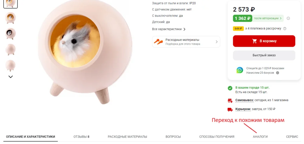 Функция показывает пользователю аналогичные товары. Например, на сайте «ВсеИнструменты» под описанием продукта есть меню с кнопкой «Аналоги».