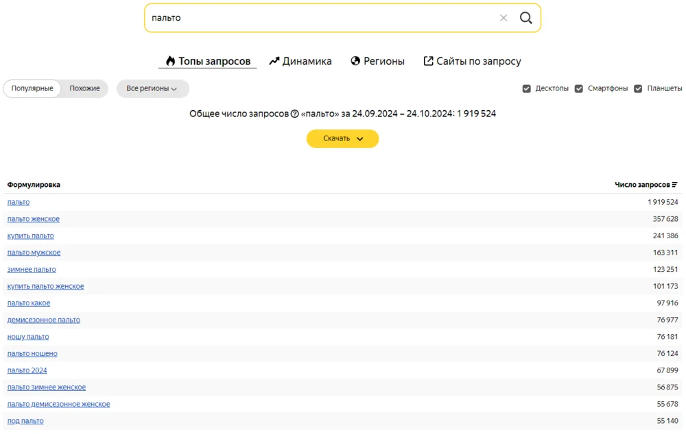 Вордстат показывает количество запросов по разным формулировкам. Например, «пальто женское» искали более 350 000 раз, а «пальто мужское» — в 2 раза меньше. Формулировка «демисезонное пальто» встречается гораздо чаще, чем «пальто на осень». Самый популярный цвет, который ищут пользователи, — черный. Уже этой информации достаточно, чтобы приоритизировать товары, составить категории под запросы пользователей и выбрать правильные формулировки для текстов.