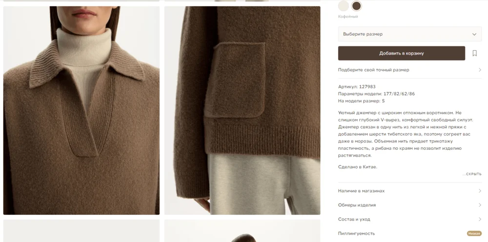 Описание товара. У некоторых брендов словесное описание и характеристики идут двумя разделами. В первом продавец рассказывает о товаре, а во втором — указывает технические детали. Например, у магазина одежды 12 STOREEZ под описанием расположена информация о размерах и составе изделия.