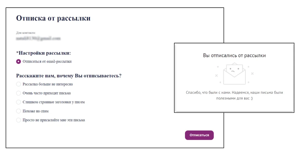 Уровень отписок тоже влияет на репутацию. Но обычно, если количество не превышает 1% от списка контактов, то письма не признаются спамом. При этом число отказов от рассылки можно снизить, если своевременно выявить причины. В этом как раз и помогает страница отписки.